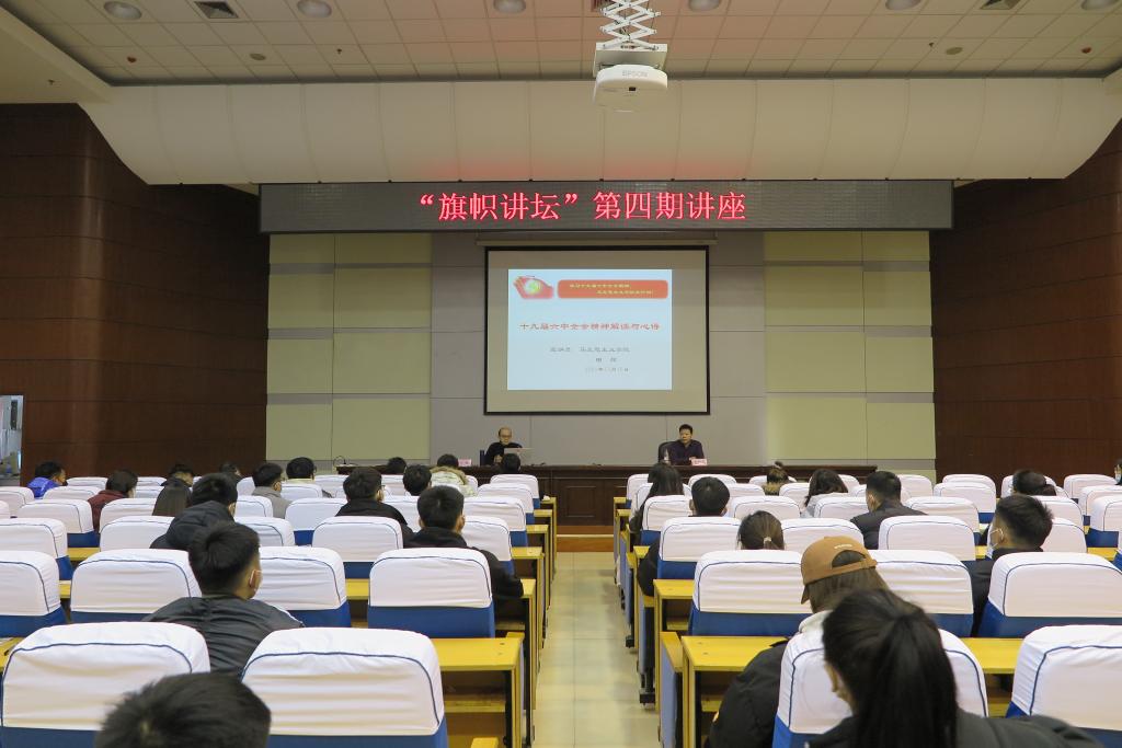 2021年12月16日下午,beat365“旗帜讲坛”第四期讲座在秦皇岛校区学术交流中心举办,专题宣讲十九届六中全会精神。beat365亚洲体育官方网站全体教师、体育与健康学院师生党员及学生入党积极分子等共100余人听取了讲座。